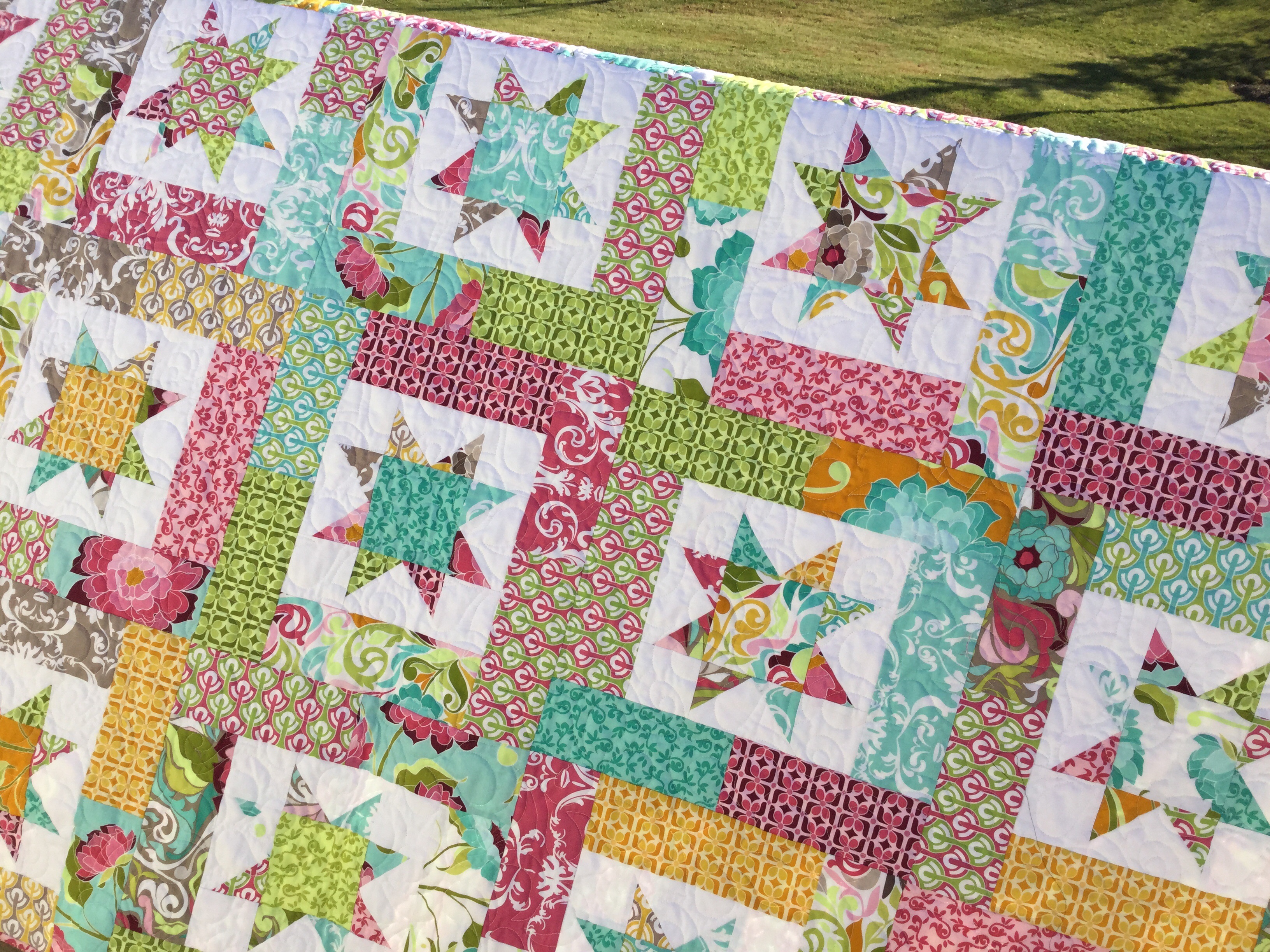 To find the Lucky Stars KIT and/or pattern, visit the SewModDesigns Etsy shop. Kit includes fabrics to piece the lap sized quilt top(60″x75″), binding and the pattern, $68.75 plus shipping. There is also yardage available in the shop as well.