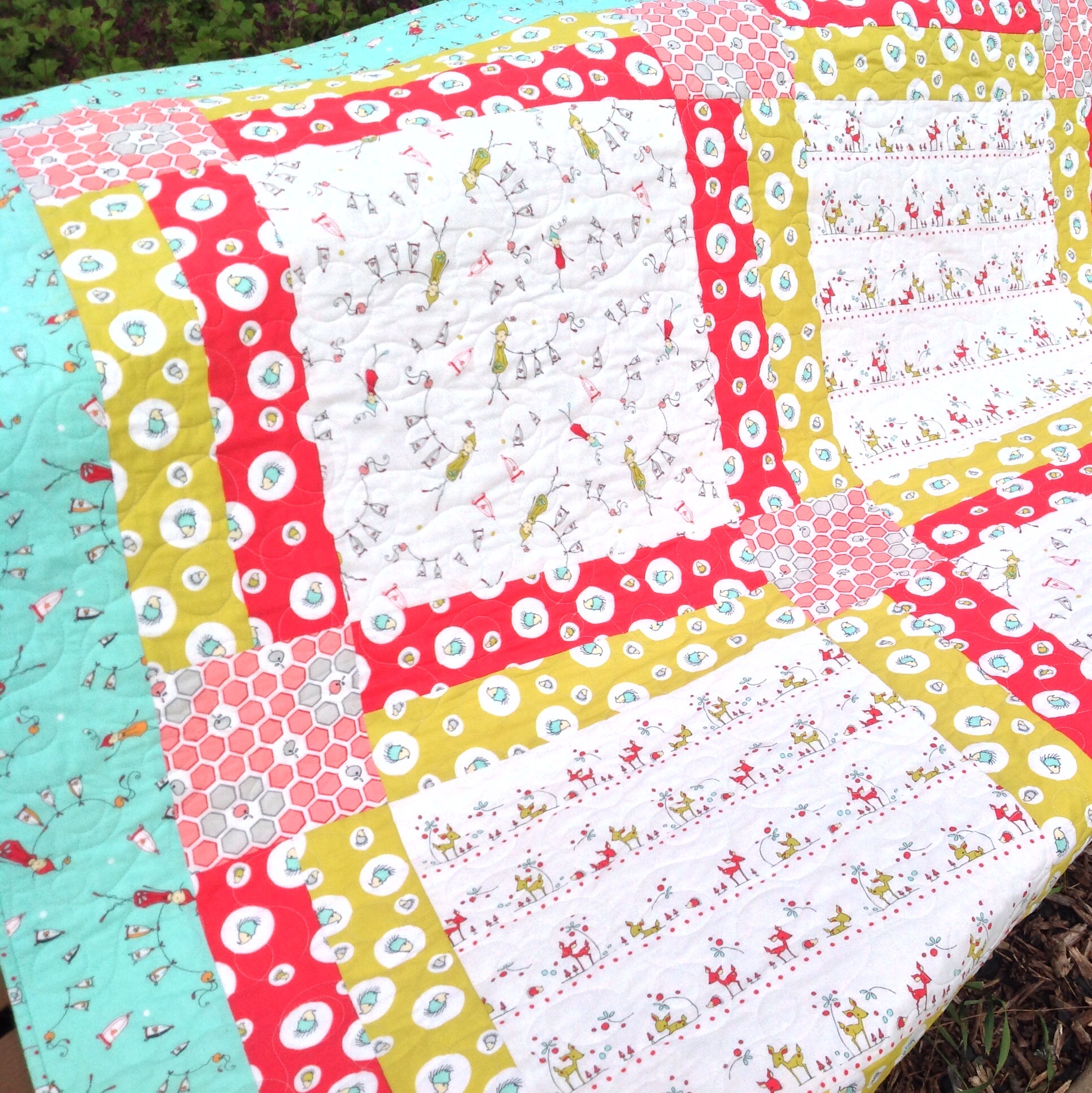 Welcome a new baby in with a fresh new quilt! Brighten up a child’s decor, use a throw on the floor for baby to play on, or take it and baby to the park for playtime. The Folk Tale fabric line features flying fairies, cute birdcages, hexagons & hedgehogs. And did I mention those sweet, adorable little deer…oh dear.
