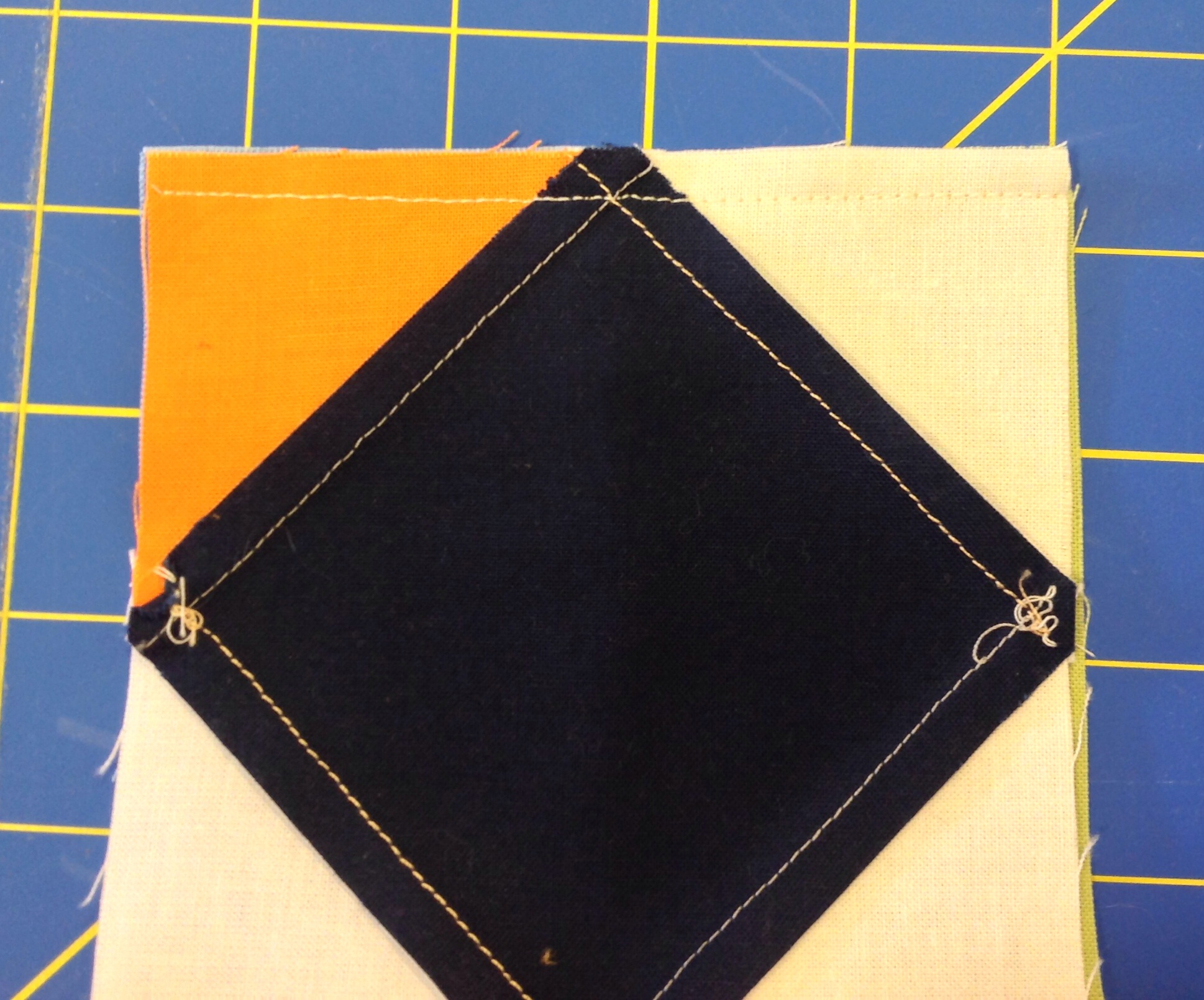 Place one of the white squares and one of the orange squares in opposite corners of the dark blue square. Sew directly on the diagonal line.