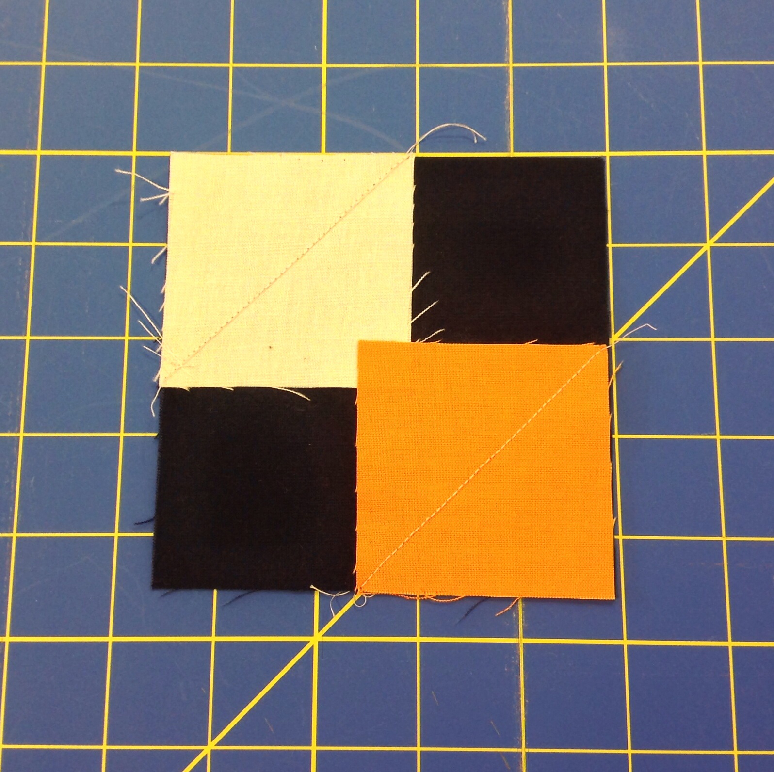 Using the same method as you did to make the corner squares, place a 2.5″ orange square in opposite corners of the 4.5″ white square. Sew on the diagonal line. Trim 1/4″ away from your seam and press.