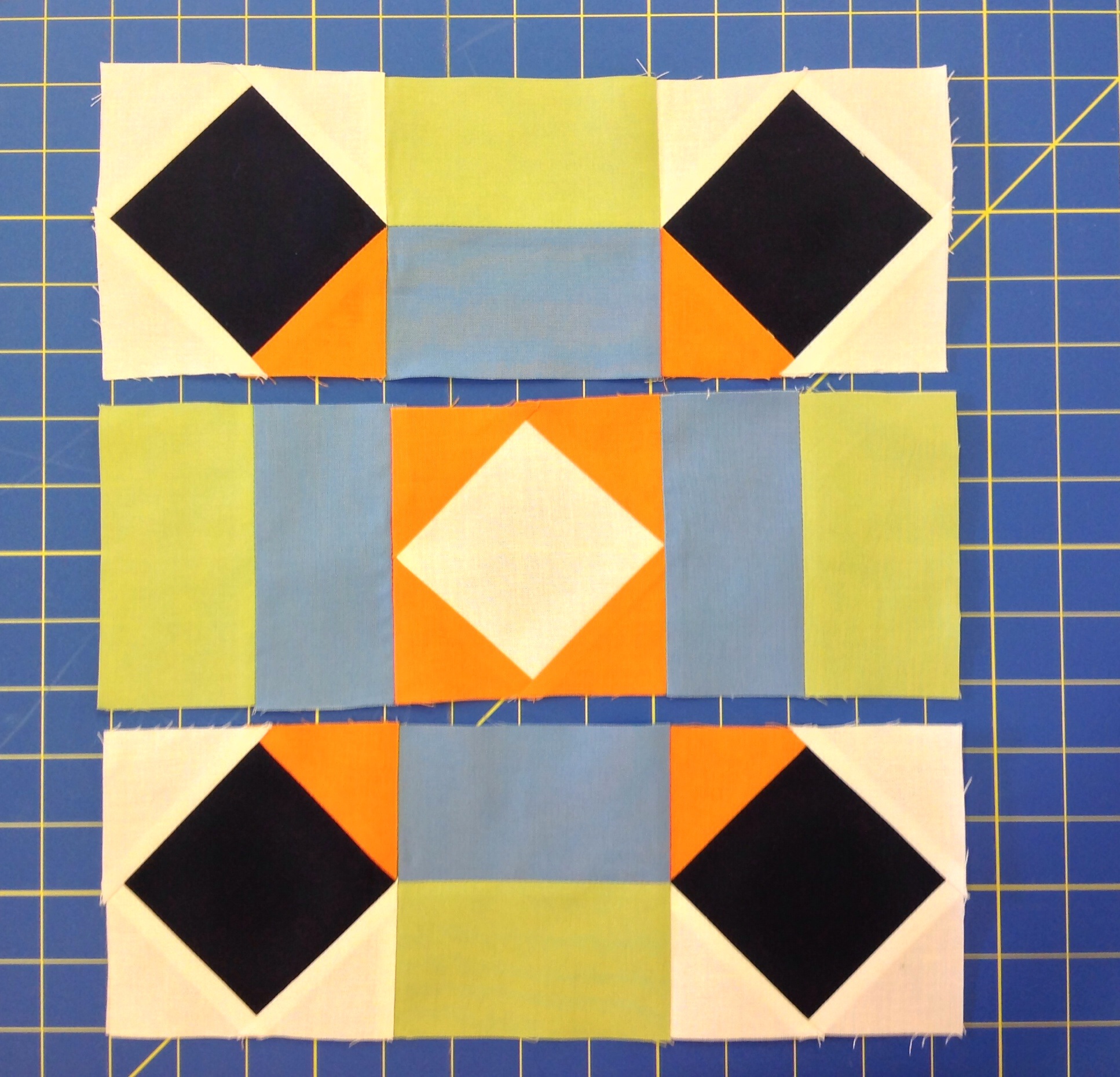 Lay out the block according to the photo. Begin by sewing the blocks into 3 rows.